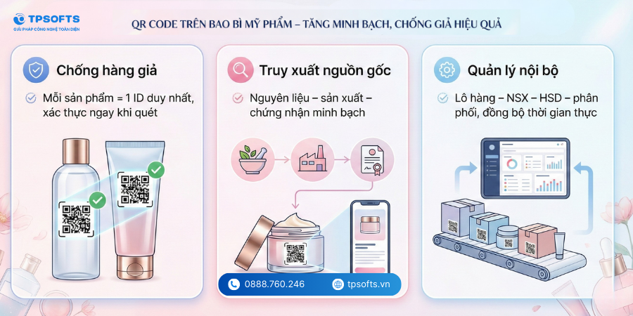 Trong ngành mỹ phẩm, việc bảo vệ thương hiệu và đảm bảo minh bạch thông tin sản phẩm là mối quan tâm hàng đầu của doanh nghiệp. QR Code trên bao bì không chỉ giúp chống hàng giả mà còn hỗ trợ truy xuất nguồn gốc và quản lý dữ liệu nội bộ, mang lại giá trị thiết thực cho cả doanh nghiệp và người tiêu dùng.