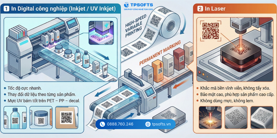 Để in chính xác và đồng bộ hàng triệu mã QR Code biến đổi trên bao bì mỹ phẩm, doanh nghiệp buộc phải sử dụng các công nghệ in dữ liệu biến đổi hiện đại. Dưới đây là hai công nghệ in công nghiệp tối ưu nhất đang được các nhà máy bao bì mỹ phẩm tin dùng.