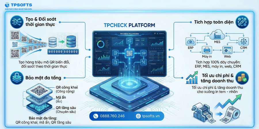 TPCHECK tích hợp linh hoạt với ERP, MES, máy in digital, laser, máy đóng gói tốc độ cao, hệ thống bế – chia – dán nhãn, cũng như website và CRM của thương hiệu. Điều này giúp các doanh nghiệp mỹ phẩm triển khai QR Code trực tiếp lên bao bì mà không gián đoạn quy trình sản xuất hiện tại.
