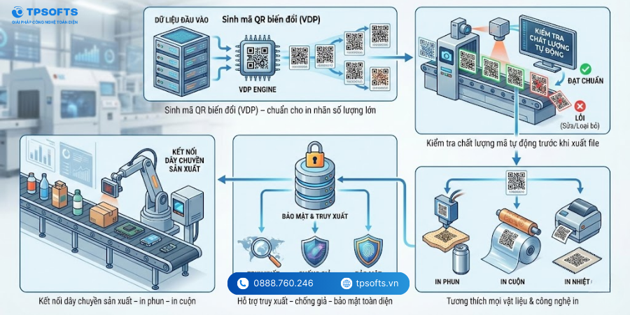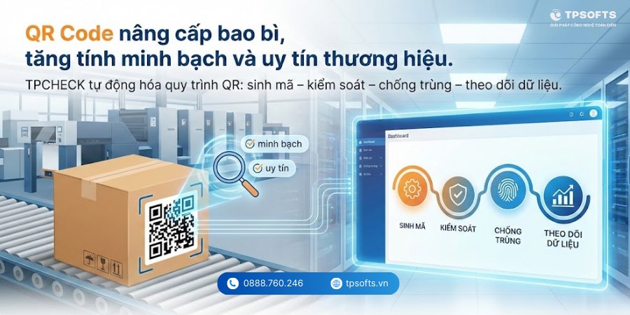 In mã QR Code trên nhãn nâng cấp quy trình sản xuất và tăng uy tín thương hiệu. Phần mềm TPCHECK để tự động hóa toàn bộ quy trình mã QR, đảm bảo tem nhãn quét nhanh, dữ liệu an toàn và vận hành hiệu quả hơn. Nếu bạn đang tìm một giải pháp in QR Code chuyên nghiệp, đáng tin cậy cho hệ thống của mình, TPSOFTS sẵn sàng đồng hành.