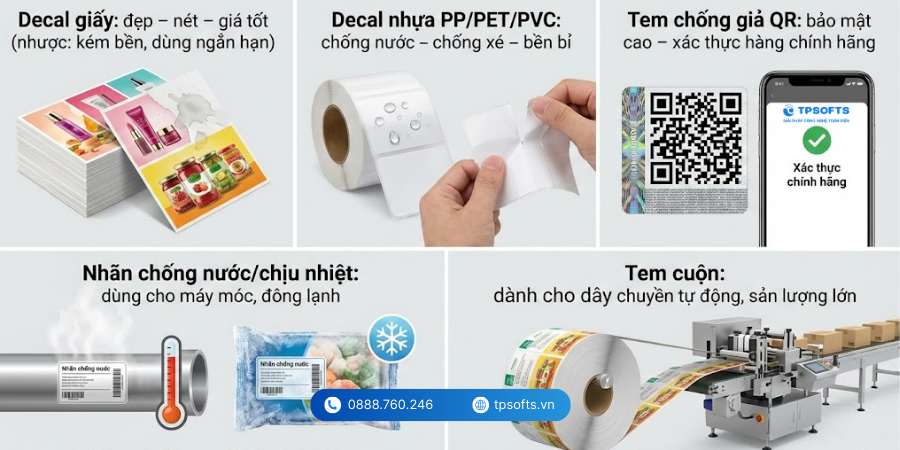 Việc lựa chọn đúng loại nhãn và vật liệu in QR Code quyết định trực tiếp đến độ sắc nét, tốc độ quét và độ bền của mã. Dưới đây là các chất liệu tem, nhãn phổ biến mà doanh nghiệp thường sử dụng khi triển khai in QR Code trên sản phẩm và bao bì.